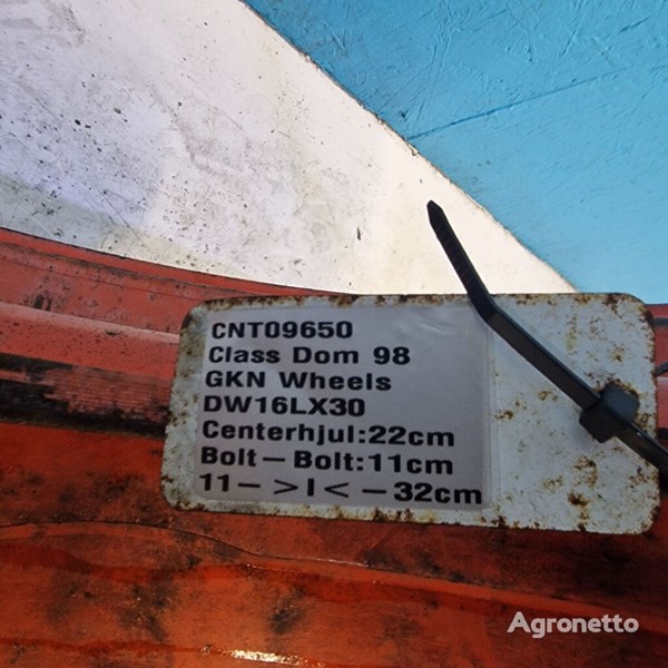 Eng: The rim has been on a Claas Dominator 98. Rim size DW16Lx30. Center hole is 22cm. Distance from bolt to bolt: 11cm. The press-in is 11cm to one side and 32cm to the other side