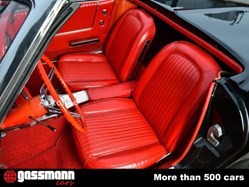 Zum Verkauf steht eine außergewöhnlich attraktive Chevrolet Corvette Sting Ray Convertible aus dem ersten Modelljahr der begehrten C2-Baureihe. Dieses frühe Exemplar präsentiert sich in seiner werkskorrekten und besonders eleganten Farbkombination Tuxedo Black mit roter Vinyl-Innenausstattung eine klassische und zugleich ausdrucksstarke Kombination