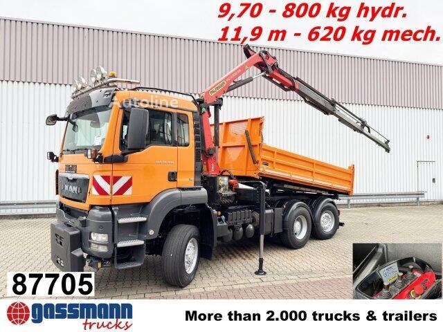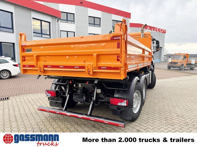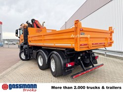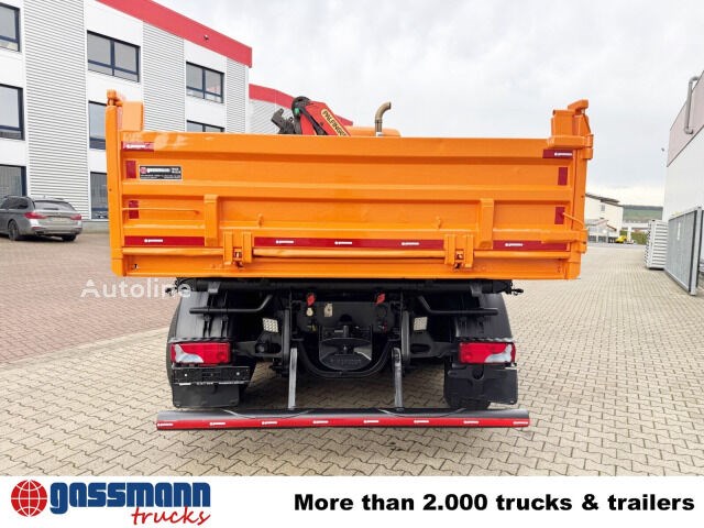 Aufbau: 3-Seiten-Kippaufbau mit umschlagbarer Pendelklappe hinten (nicht abnehmbar) & Kran Palfinger PK 9002-EH B mit Funksteuerung (Remote-Control)